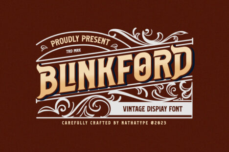 Step back in time and embrace the nostalgic allure of Blinkford, a captivating uppercase display font that transports you to an era of timeless elegance and vintage charm. The characters are bold and robust, evoking a sense of grandeur and prominence that harks back to a bygone era. The generous spacing in Blinkford is designed to give your text room to breathe. This open layout enhances legibility and imparts a sense of spaciousness that is characteristic of vintage typography. As a special bonus, this font includes ornaments. In addition, enjoy the features here.