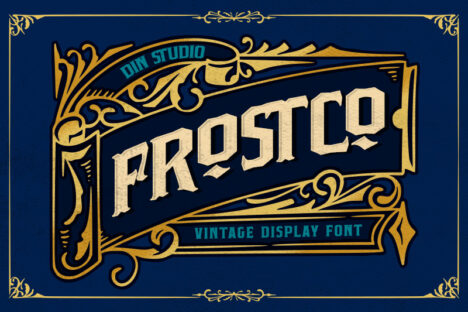 Introducing Frostco – a bold, vintage-style display font that captures attention with its rugged charm. Crafted in all caps with a strong, bold weight, Frostco stands out with its distinctive outline, which is made in subtle curves and irregularities instead of straight lines. This unique touch adds an authentic, handcrafted feel, perfect for retro-inspired vibes. As an extra, this font gives ornaments. In addition, enjoy the features here.