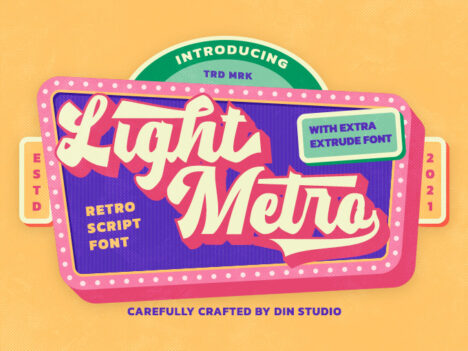 Light Metro is a script font in solid, thick outer lines to live up your brand. Inspired by the 1960-1970s font style, it expresses vintage touch in stylish look and its thick-angled displays are legible and great to watch. Light Metro becomes even more special with the extrusion version. Our font always includes Multilingual Support to make your branding reach a global audience.